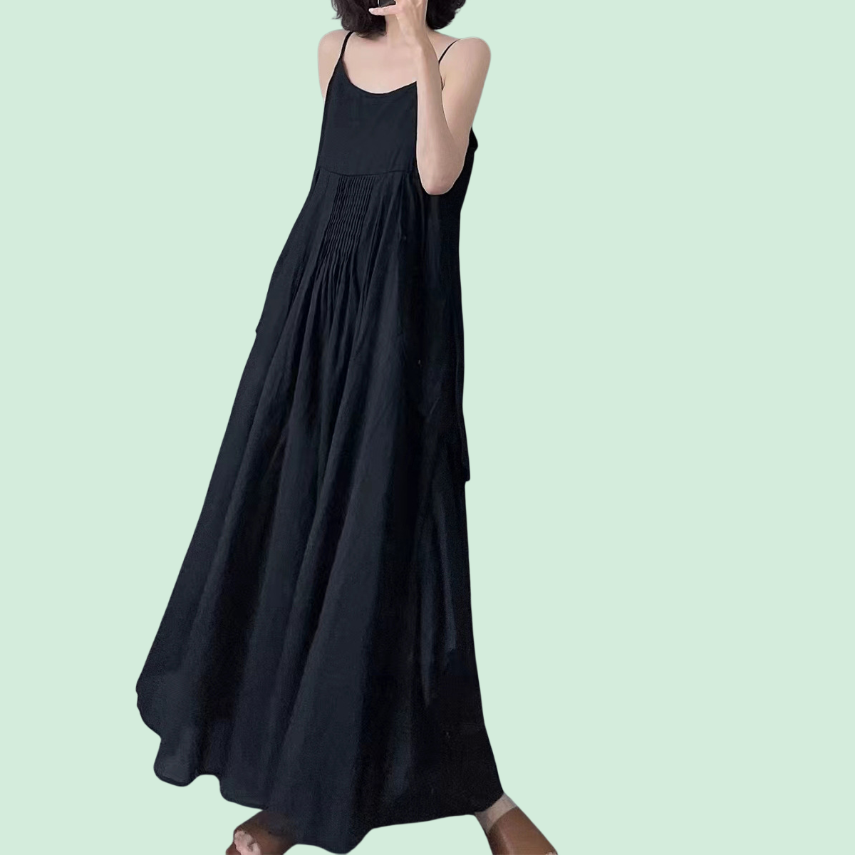 일본 스타일 민소매 슬립 원피스, 가벼운 소재와 세련된 디자인, 여름 데일리룩으로 적합, 편안한 착용감 제공