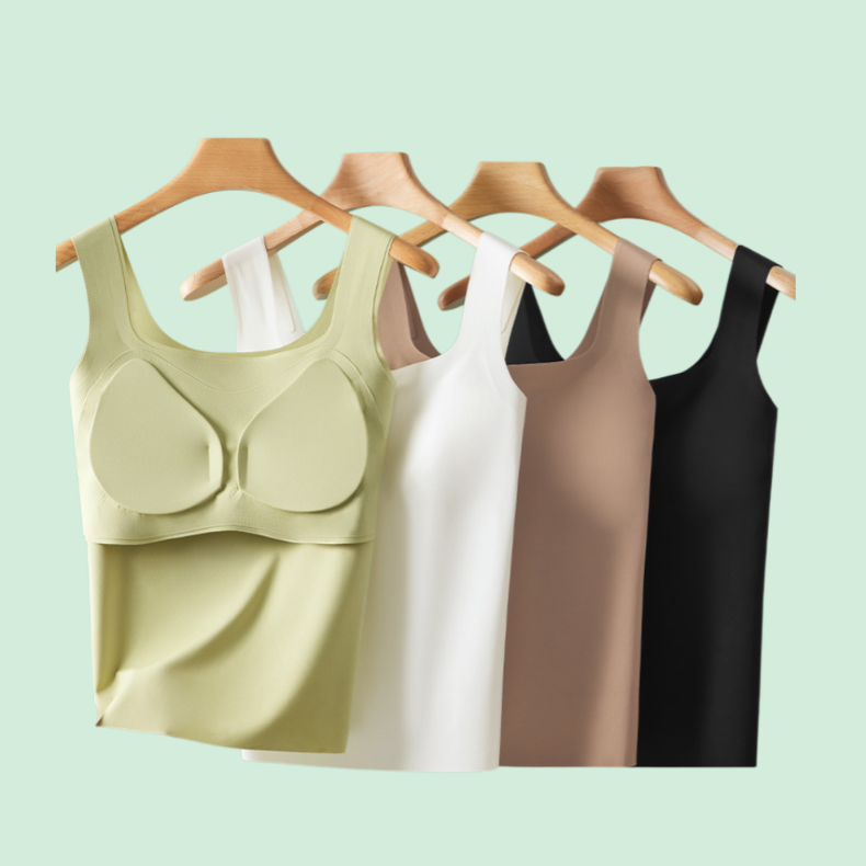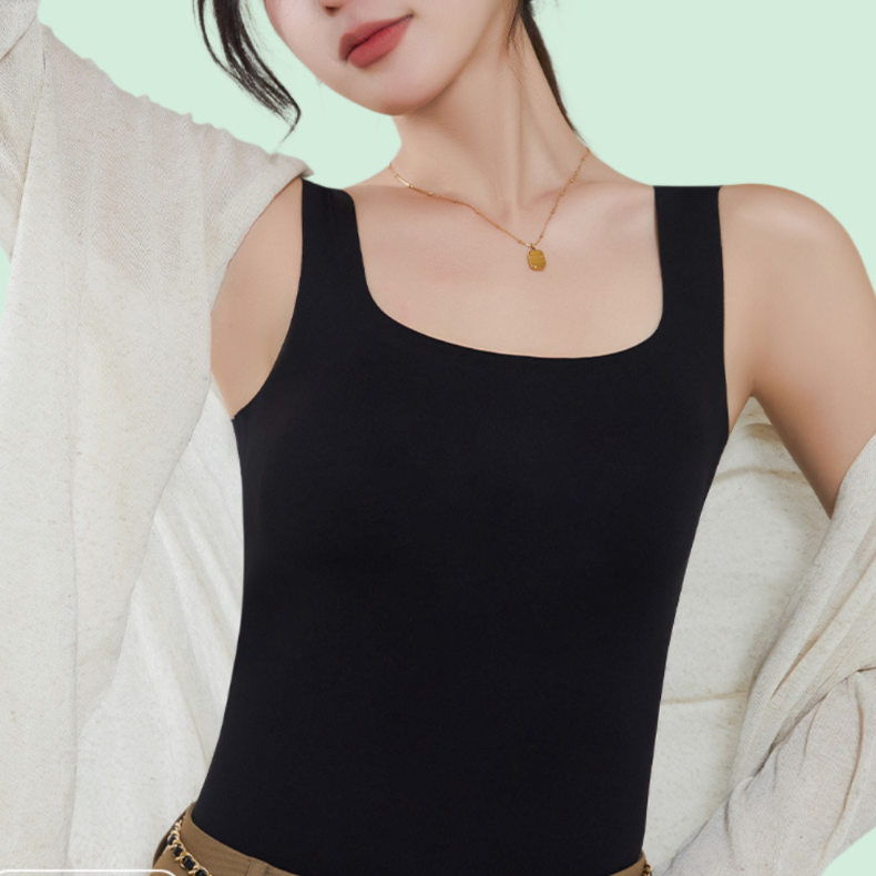 아이스 실크 소재로 시원함 유지, 무봉제 디자인으로 편안한 착용감, 패드 내장으로 속옷 대용 가능, 스퀘어넥 민소매로 다양한 스타일 연출